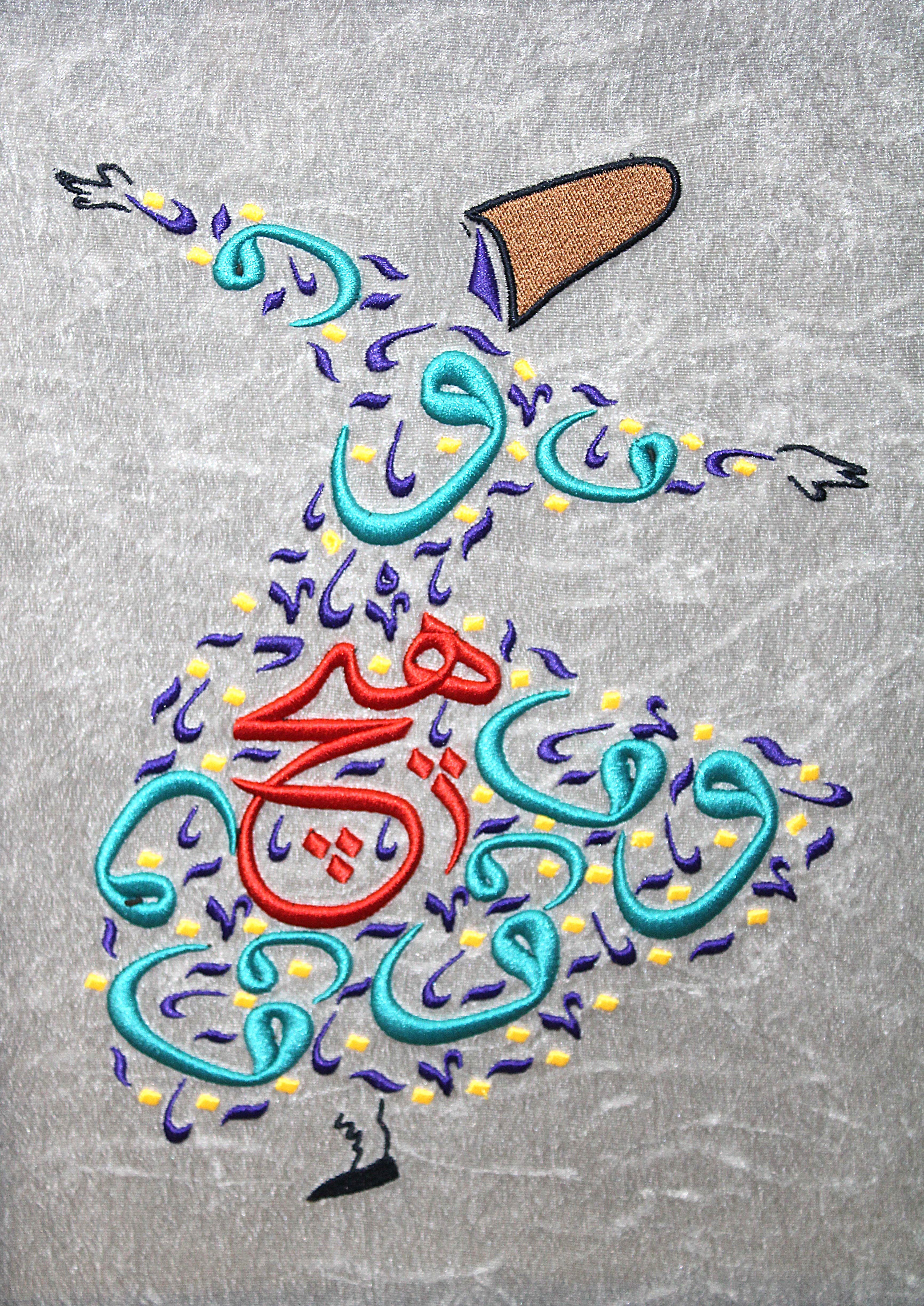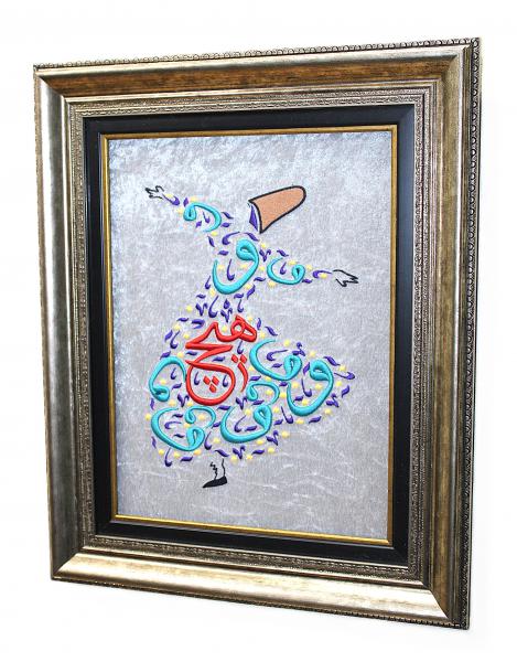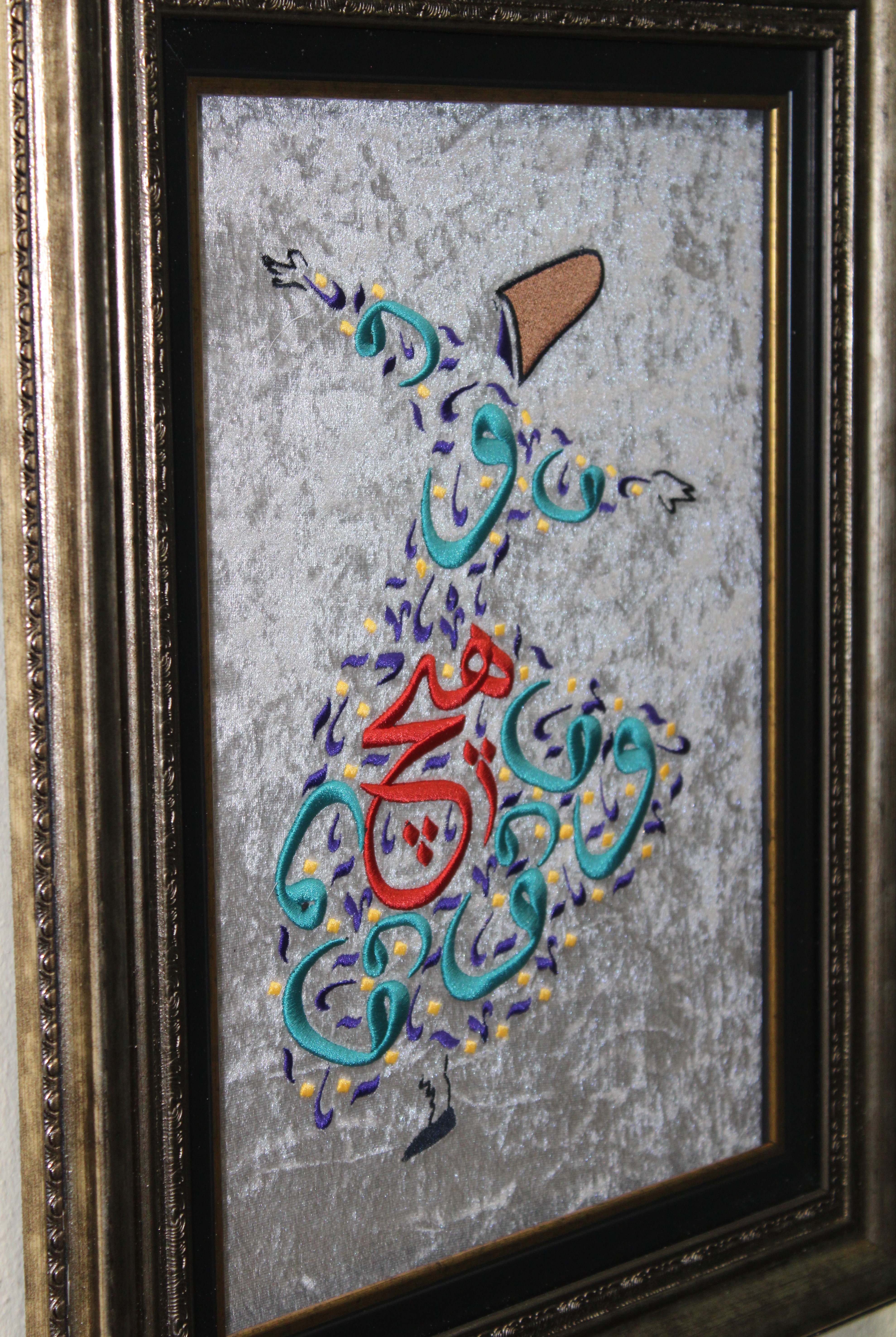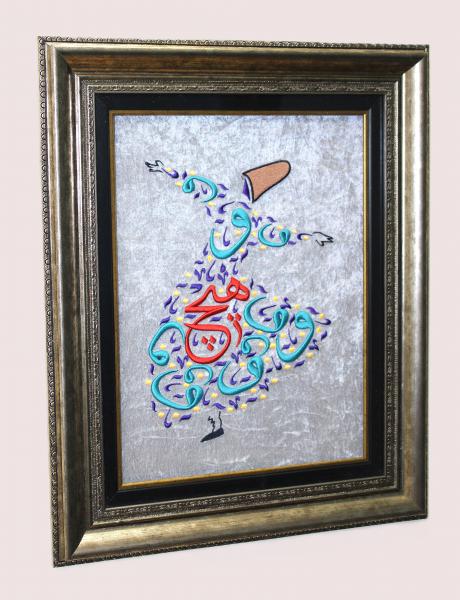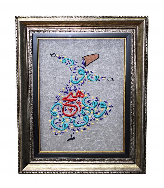 • Sufizm'in temsili "Hiç" hat yazısı semazen formuna getirilerek yazılmış ve özel tasarlanan kalıp sayesinde kadife kumaş üzerine nakışlanarak sizler için eşsiz bir tablo haline getirilmiştir.