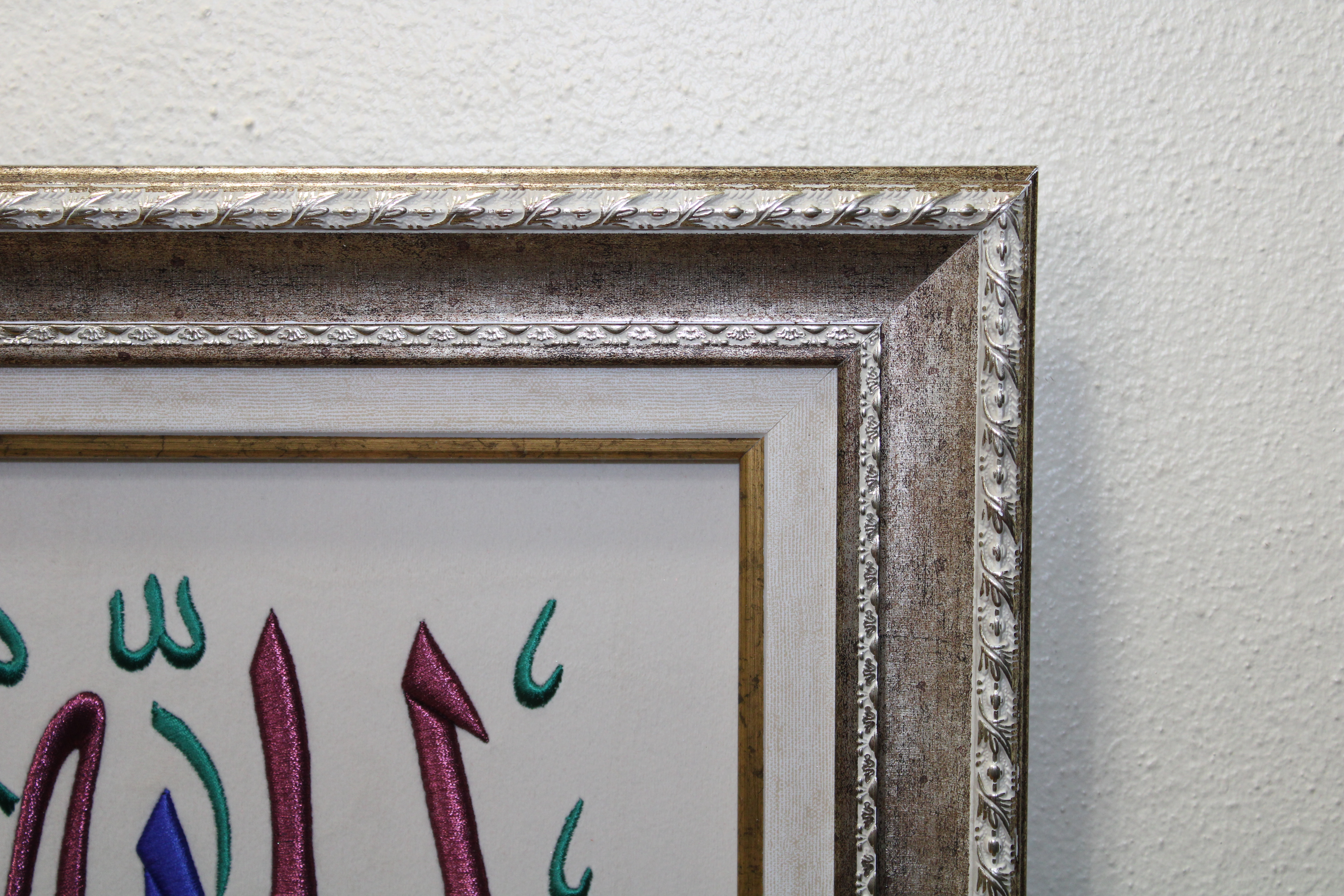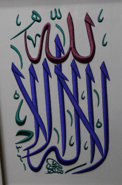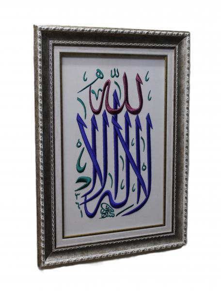 "La İlahe İllallah" Hat Yazısı krem kadife kumaş üzerine maraş işi tekniği ile nakış yapılarak tablo haline getirilmiştir.