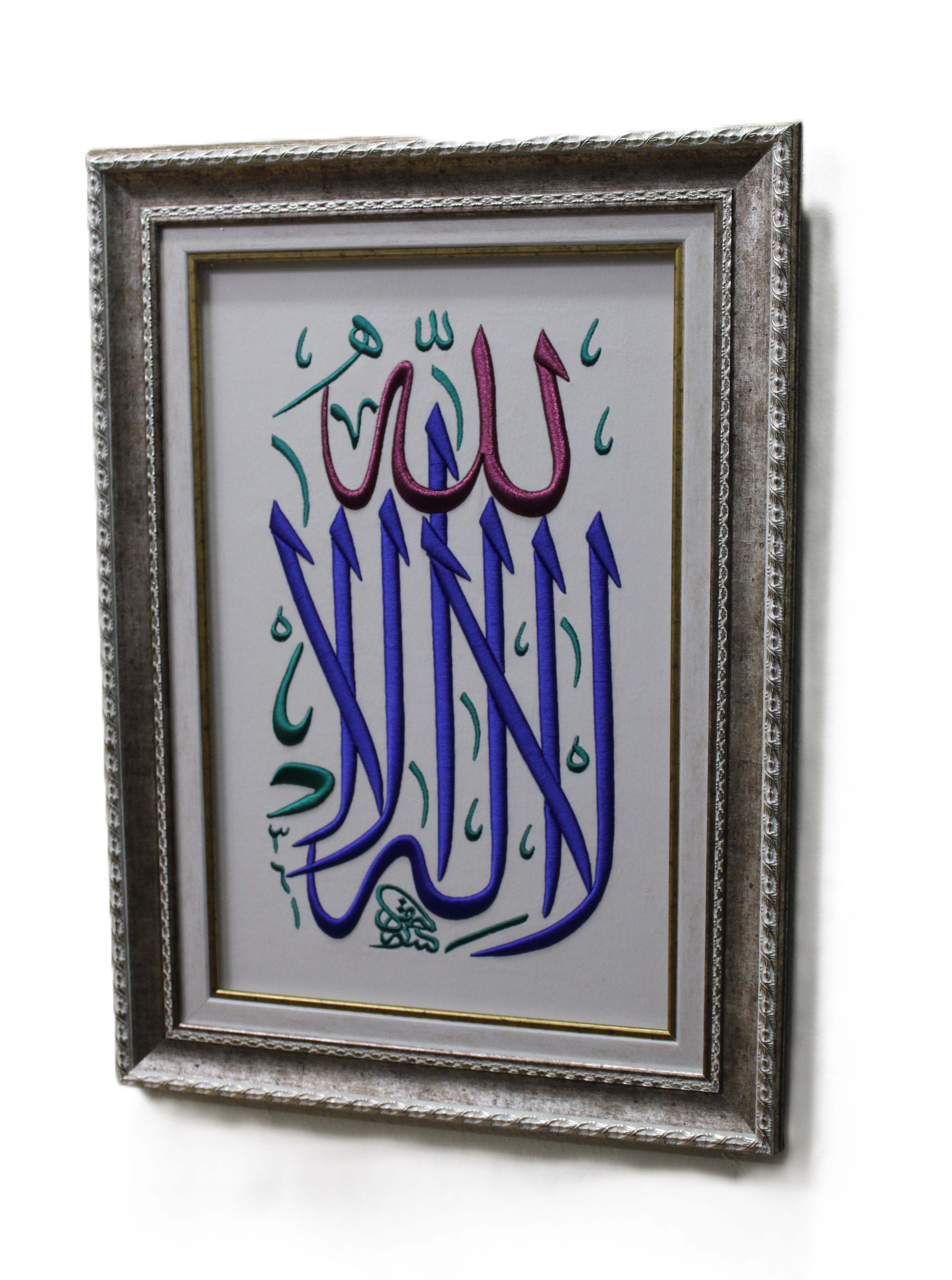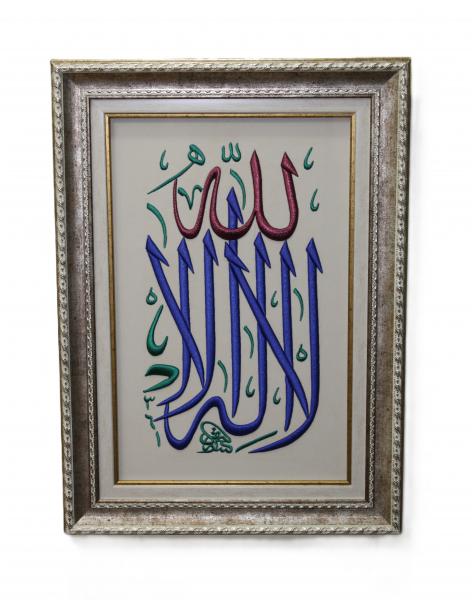 "La İlahe İllallah" Hat Yazısı krem kadife kumaş üzerine maraş işi tekniği ile nakış yapılarak tablo haline getirilmiştir.